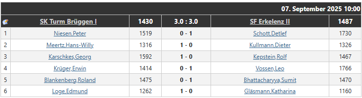 Zum Saisonauftakt der Bezirks-Klasse Süd zeigte unsere zweite Mannschaft beim SK Turm Brüggen eine beeindruckende Leistung. Trotz des ungewohnten Terrains als Aufsteiger und der traditionell heimstarken Gastgeber hätte der Mannschaftssieg am Ende durchaus nach Erkelenz gehen können. Das 3:3 spiegelt den umkämpften Spielverlauf wider – bei etwas mehr Fortune in den entscheidenden Momenten wären sogar zwei Mannschaftspunkte drin gewesen.