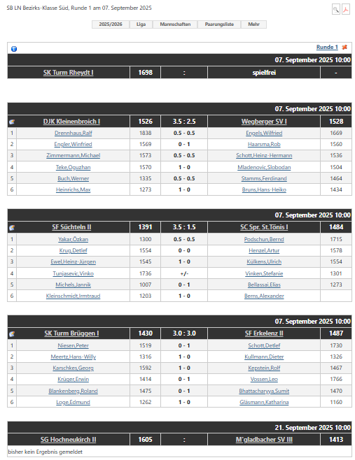 Hier sind die Mannschaftsergebnisse der Runde 1 am 07.09.2025 der SB LN Bezirks-Klasse Süd in Tabellenform: