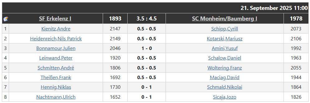 Die neue Regionalliga-Saison 2025/26 begann für die 1. Mannschaft der Schachfreunde Erkelenz mit einer Enttäuschung. Trotz großen Kampfgeistes musste sich das Team zum Auftakt knapp mit 3,5 : 4,5 gegen den Aufsteiger SC Monheim/Baumberg geschlagen geben.