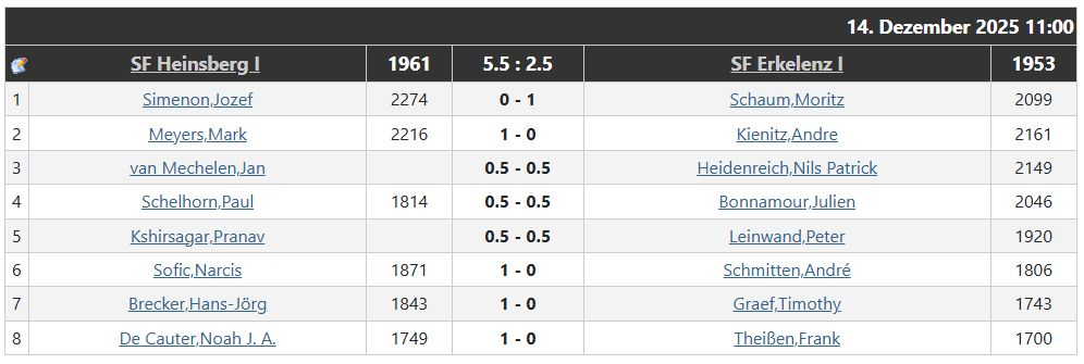 Durch diese erneute Niederlage bleiben die Schachfreunde Erkelenz weiterhin auf dem letzten Tabellenplatz. Die Situation in der Regionalliga spitzt sich damit weiter zu, der Druck vor den kommenden Begegnungen wächst deutlich. In den nächsten Spielen will die Mannschaft rund um Mannschaftsführer André Schmitten alles daransetzen, die Negativserie zu beenden und wichtige Punkte im Kampf um den Klassenerhalt zu sammeln.