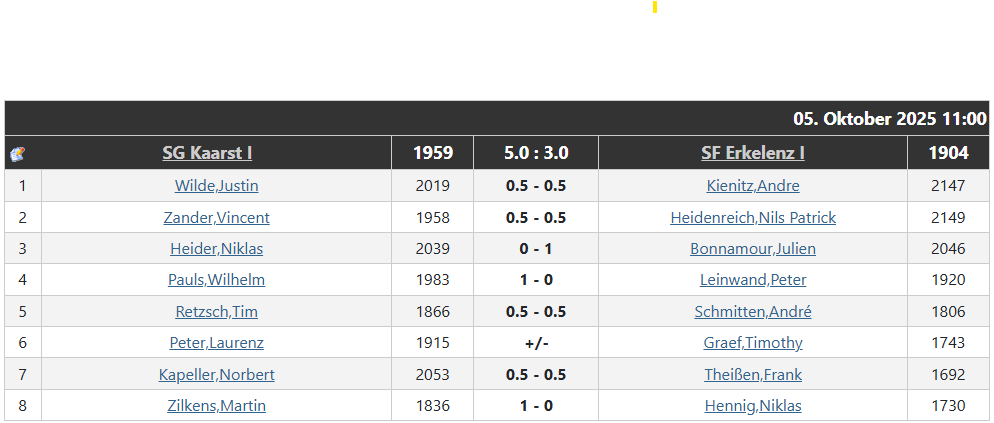 Jetzt hoffen die Spieler der 1. Mannschaft auf den nächsten Spieltag am Sonntag, 02.11. in Erkelenz, wenn man den SK Turm Kleve I zu Gast hat … aber auch das wird wieder kein Kinderspiel, ist man doch in dieser Saison die DWZ-schwächste Mannschaft in der starken Regionalliga im NSV 1901.